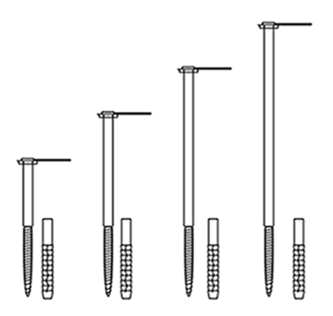 Négy különböző hosszúságú dűbelt (tüskét) kínálunk csőbilincsekhez:hosszuk 120 mm, 160 mm, 200 mm és 250 mm.