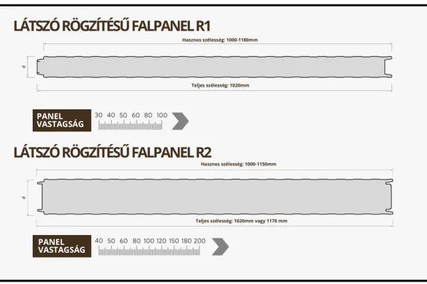 A látható csatlakozású hőszigetelő  falpanelek vízszintesen és függőlegesen is felszerelhetők, ezáltal praktikus és gazdaságos megoldást nyújtanak mindazok számára, akik látható csatlakozású, masszív és megbízható paneleket keresnek. Látszó rögzítésű falpanelek elérhetőek: PUR ( Poliuretán töltet) és PIR ( Poliizocianurát ) töltettel is. Szendvicspanel korlátozott palettával elérhető készletről is, de egyedi igények szerint is tudunk gyártást indítani megfelelő mennyiséggel.