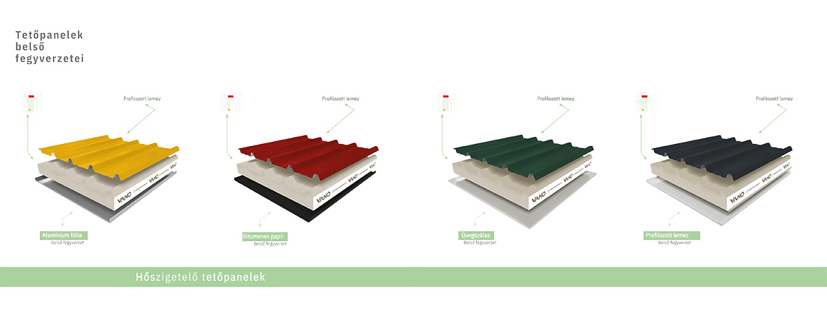 Tetőpaneleink fegyverzetei változatosak és minden felhasználásra külön-külön kifejezetten arra az építményre/területre alkalmas szendvicspaneleket tudunk kínálni.Külső fegyverzet mindig profilozott lemez, ennek profilozása 4 féle minta közül választható. Belső fegyverzete lehet például alumínium fólia, aminek alkalmazása költséghatékonysága vagy könnyű súlya miatt ajánlott. Bitumenes papír belső fegyverzetünk jellemzően lapos, alacsony lejtésű tetőknél lehet opció, mert a hagyományos profilozott szendvicspanelnél statikailag erősebb a fordított beépítés miatt. Vegyi anyagokkal és baktériumokkal szemben nagy ellenállást biztosít üvegszálas belső fegyverzetünk, aminek alkalmazása higiénés területekre alkalmas és agresszív anyagoknak is ellenáll. Továbbá elérhető még a hagyományos mindkét oldalán profilozott lemez fegyverzetű szendvicspanel.